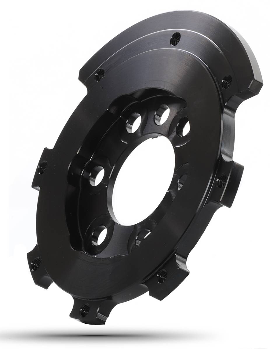 The cover assembly is machined from billet aluminum and is then Type 3 hard anodized. Our billet covers have roughly 25% more tensile strength than the competition’s cast unit. By focusing our ability on machining the strongest cover possible while maintaining minimal weight, we are basically able to eliminate any flex in the cover. Our billet covers see only .003" of flex where as a cast or stamped unit can see as much as .030" of flex. By eliminating this flex in the cover, the driver is able to operate the clutch much more consistently and confidently. All the movement being applied to the diaphragm of the clutch from the throwout bearing is used solely to engage and disengage the clutch and isn't wasted by the cover flexing first. The strength of our covers also results in greater clamping force over the same amount of area vs. a cast or stamped cover. This means our triple discs are easy to drive and have superior clamping force to make sure all the power your engine is making is being utilized.